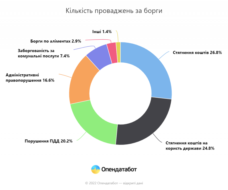 Быстрее всего растут такие категории долгов, как взыскание средств, то есть долги физических лиц по кредитам, а также перед компаниями и организациями – рост на 47%, то есть +567 тысяч долгов, сообщает Опендатабот. На втором месте по темпам роста – долги за коммуналку, за год их стало больше на 41%, то есть на 140 тыс. Общий долг украинцев за коммуналку на первое декабря 2021 года составлял 72,7 млрд грн. Растут долги и в делах об административных правонарушениях - +35% или +285 тыс долгов.