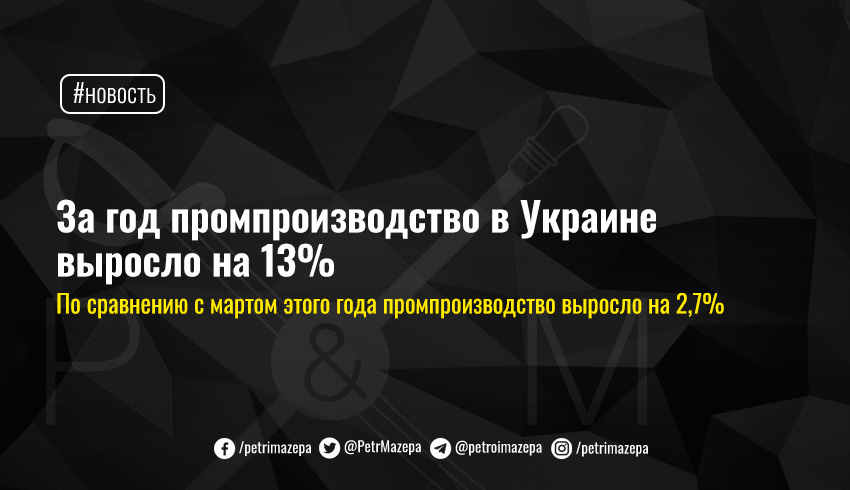 Промышленное производство в апреле выросло на 13% в годовом выражении (по сравнению с апрелем прошлого года).