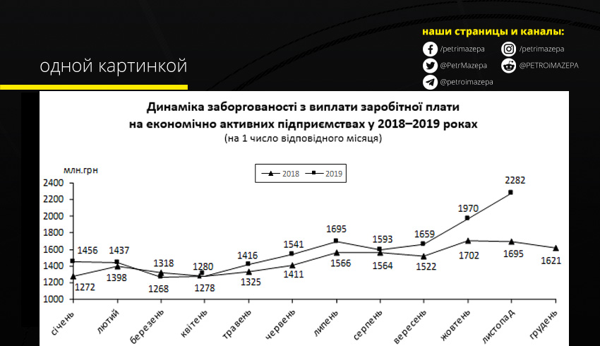 Как видно из графика, задолженность по выплате зарплат в Украине растет уже 3 месяц подряд, а с начала года она увеличилась на 826 млн гривен. Больше всего в октябре выросли долги по выплате зарплат в сфере искусства, развлечений, спорта и отдыха - почти в 15 раз, уточняет «Громадське».