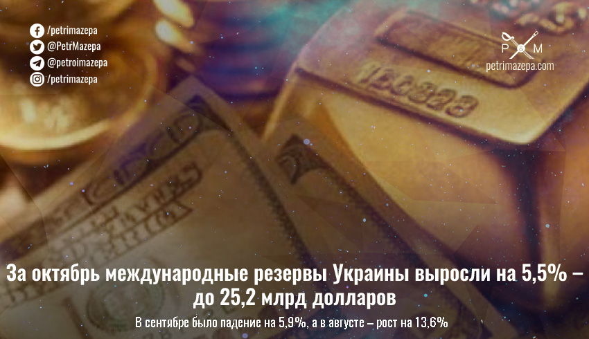 За октябрь международные резервы Украины выросли на 5,5% – до 25,2 млрд долларов