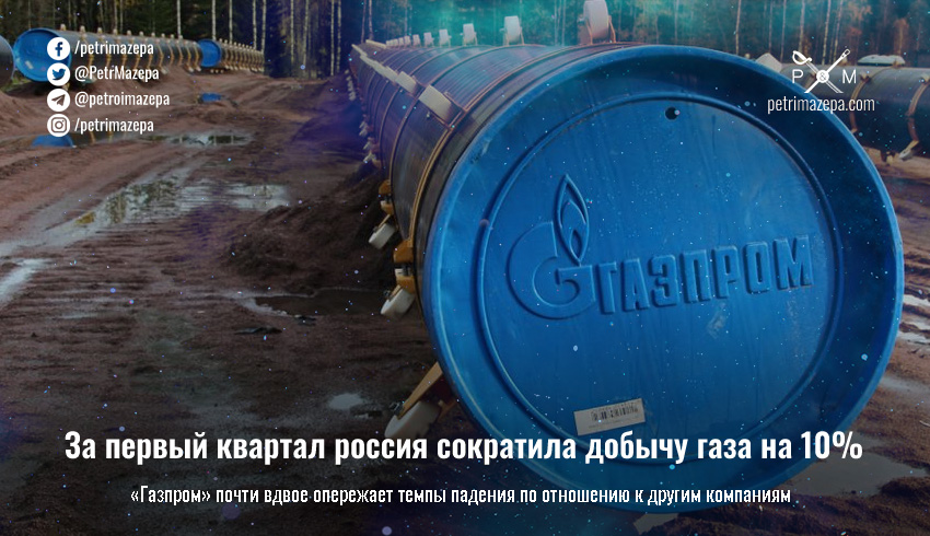 Если обратиться к цифрам, то российское СМИ приводит такую статистику — в январе-апреле производство газа упало на 10% год к году, до 235 млрд кубометров, в апреле — на 10,3%, до 55 млрд кубометров.