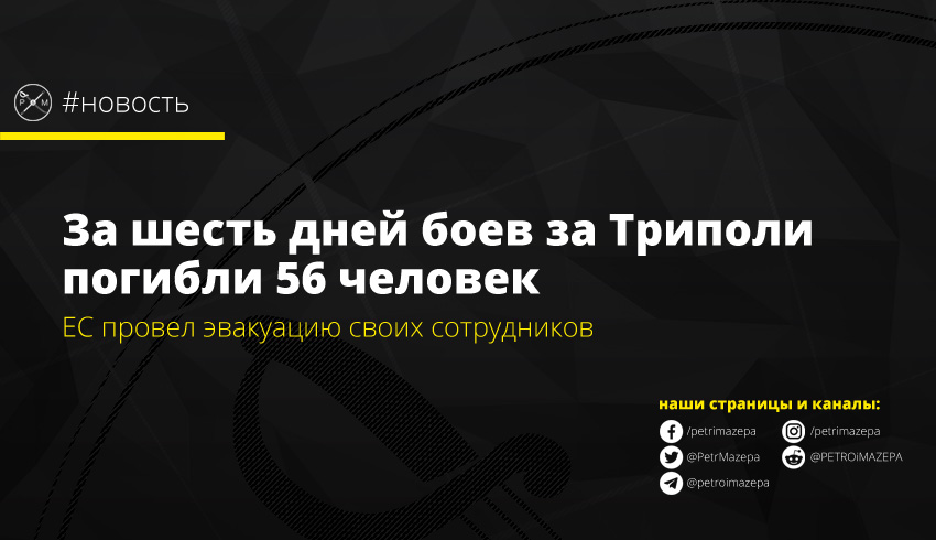 Армия международно признанной власти Ливии продолжает бои с повстанцами за контроль над столицей страны Триполи. По информации Всемирной организации здравоохранения ООН, за шесть дней противостояния по меньшей мере 56 человек погибли, еще 266 получили ранения различной степени тяжести. Евросоюз принял решение эвакуировать своих сотрудников из страны.