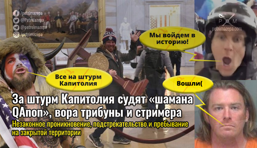В США федеральный суд округа Колумбия предъявил трем мужчинам обвинения в связи с беспорядками у Капитолия США в среду, 6 января 2021 года. На скамье подсудимых оказались герои двух самых вирусных образов со штурма – «шаман QAnon» и мужчина, выносивший их Капитолия трибуну спикера. Третьим стал стример, призывавший людей присоединяться к штурму.