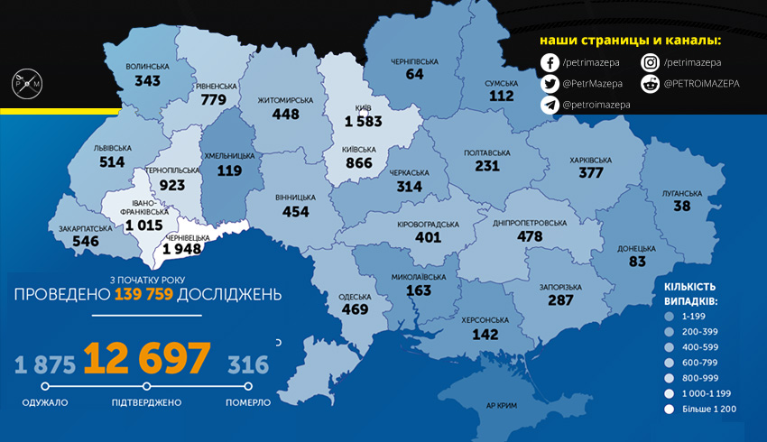 Всего в Украине с начала пандемии подтверждено 12697 случаев COVID-19, из них за последние сутки - 366. Болезнь подтверждена у 881 ребенка и 2479 медиков. Общее количество тестов, проведенных методом ПЦР, 139 759 образцов.