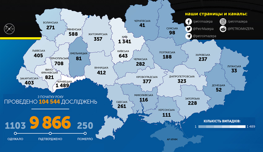 По данным Центра общественного здоровья Украины по состоянию на 9:00 29 апреля в Украине 9866 лабораторно подтвержденных случаев COVID-19, из них 250 летальных (+11 за сутки), 1103 пациента выздоровели (+111 за сутки). За сутки зафиксировано 456 новых случаев.
