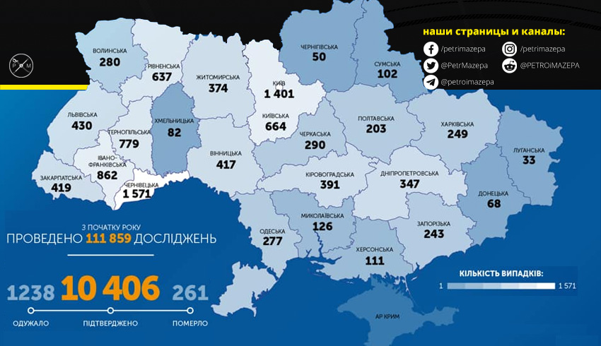 Всего в Украине на 9 утра 30 апреля подтверждено 10406 ​​случаев COVID-19, из них – за последние сутки 540 за последние сутки. 11 летальных случаев за сутки, а 135 человек – выздоровели сообщил глава МОЗ Степанов на брифинге.