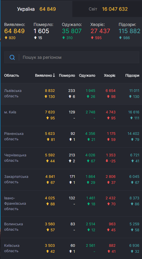 За прошлые сутки, 25 июля, в Украине было выявлено 920 случаев COVID-19, выздоровело 310 человек, скончалось 15. Всего за все время пандемии было зафиксировано 64849 случаев COVID-19, на данный момент активных больных в Украине 27437, выздоровело всего 35807 человек, скончалось 1605 человек.
