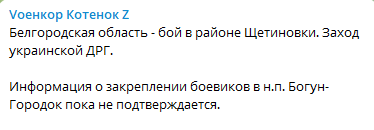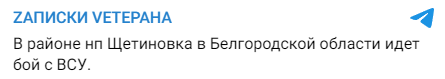 В то же время, буквально через минуту после этого, российский пропагандистский канал «ZАПИСКИ VЕТЕРАНА» заявил, что в районе Щетиновки Белгородской области идет бой.