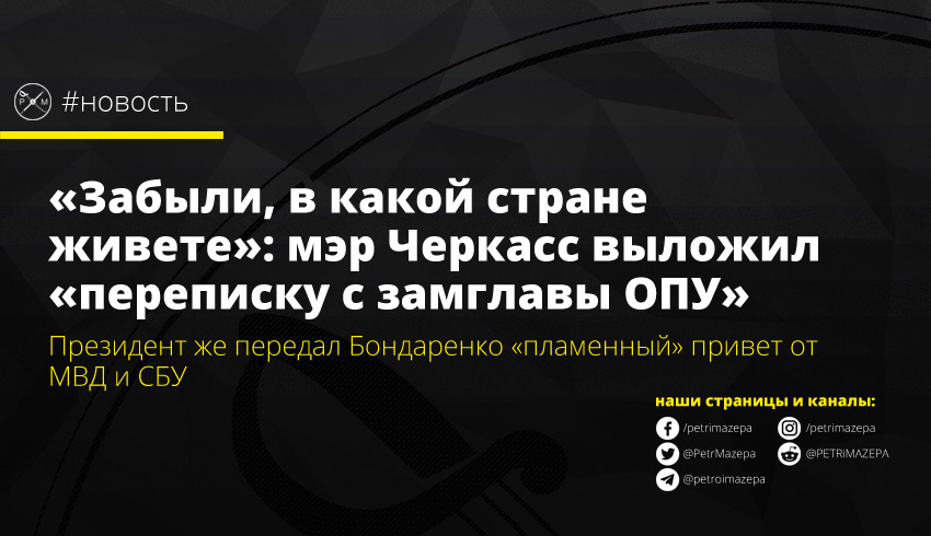 Городской голова Черкасс Анатолий Бондаренко обнародовал фото присланной ему повестки и фото переписки с замглавы ОПУ Сергеем Трофимовым, где зафиксированы некие «последние предупреждения» и обещания что Бондаренко «может оказаться под клетчатым одеялом». И хотя сам Сергей Трофимов назвал это «фейком», ранее лично президент Зеленский заявлял, что передает «пламенный» привет Бондаренко от МВД и СБУ, и обещал ему «юридические последствия».