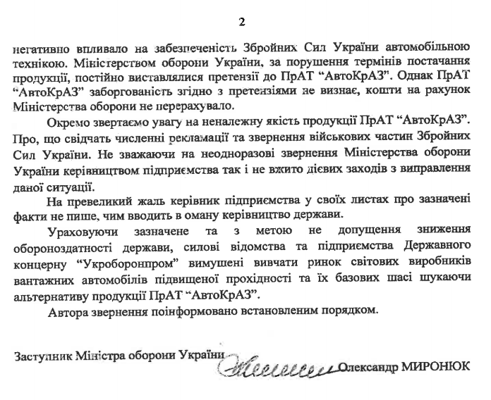 Кроме того – та продукция, которая поставлялась в ВСУ, имела крайне низкое качество, на что неоднократно жаловались воинские части. Минобороны обращалось к руководству автомобильного завода касательно устранений недостатков, но действенные меры так и не были предприняты.