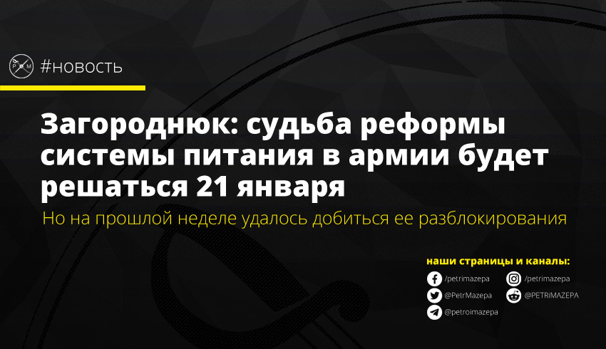 Министр обороны Украины Андрей Загороднюк сообщил, что на прошлой неделе юристам министерства удалось добиться отмены постановления о приостановлении перехода на реформированную систему питания. Но это были лишь обеспечительные меры по иску. Саму же судьбу реформы по существу начнут решать 21 января.