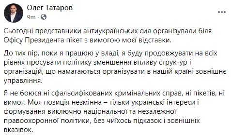 Свое заявление Татаров опубликовал в Facebook – он заявил что его позиция неизменна, а сфальсифицированных уголовных дел, требований и пикетов он не боится. Комментарии при этом он закрыл.