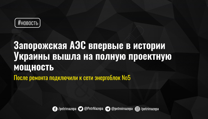 АЭС впервые в истории Украины вышла на полную проектную мощность.  Ранее, из-за недостаточной пропускной способности существующих линий передач, ЗАЭС работала с максимальной мощностью в 5300 МВт.