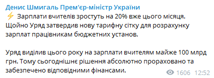 Как написал глава Кабмина в Telegram, правительство выделило в этом году на зарплаты учителям почти 100 млрд грн, поэтому сегодняшнее решение он называет «абсолютно просчитанным и обеспеченным соответствующими финансами».