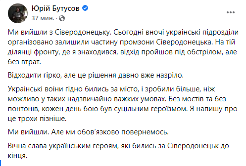 Главред издания Цензор.нет Юрий Бутусов в Facebook сообщил, что подразделения покинули город этой ночью. Отход на том участке фронте, где находился Бутусов, проходил под обстрелом, но обошлось без потерь.