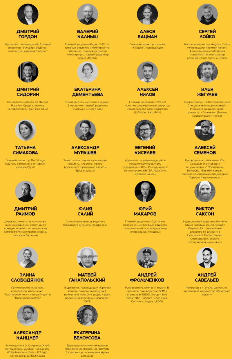 Чуть позднее о россиянах на этом курсе лекций рассказал Аркадий Бабченко, который в прошлом году также подымал шум из-за анонсирования визитов российских лекторов. И визиты в тот раз были отменены. В этом году список россиян, которые хотят приехать и учить украинцев за деньги такой: Андрей Фрольченков (сммщик в реcторане "Тануки"), Екатерина Дементьева, Татьяна Симакова (главный редактор The Village, издатель самарского интернет-издания Bigvill), Александр Мурашев (засглавреда SNOB.ru), Виктор Саксон (редакционный директор Rambler Group), Андрей Савельев (экс-креативный продюсер «Вечерний Ургант»), Илья Жегулев... «Возглавляют все это дело Дмитрий Гордон и Алеся Бацман», - завершает перечисление Бабченко.