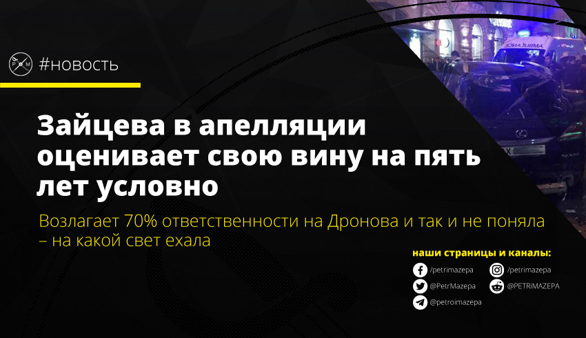 Недавно осужденная за кровавое ДТП в Харькове Елена Зайцева планирует обжаловать приговор в апелляции. Несмотря на полтора года судебного процесса, девушка так и не поняла, за какие именно действия получила 10 лет (там 6 трупов и скорость далеко за сотку, если кто забыл). Более того, смерти прохожих она возлагает на непреодолимую силу, вызванную действиями второго участника ДТП.