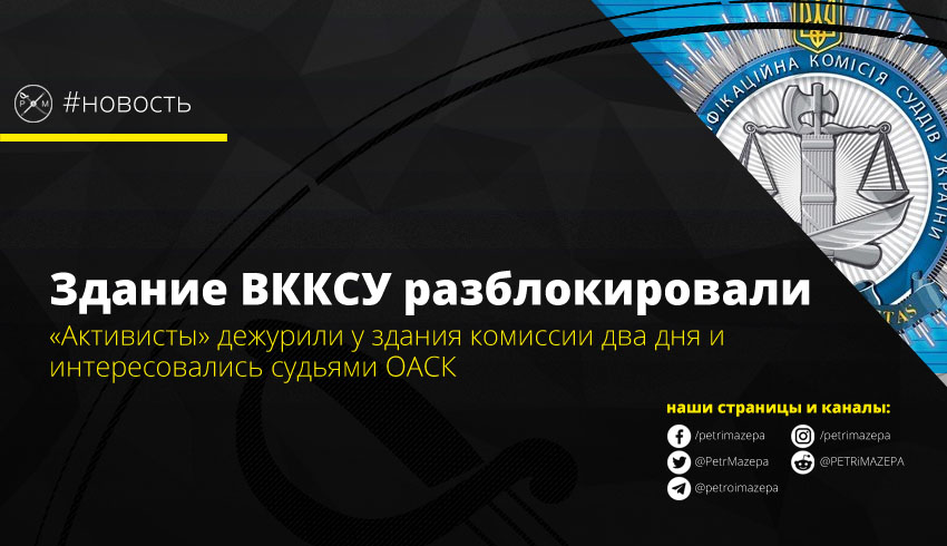 Здание Высшей квалификационной комиссии судей наконец разблокировано, и работа ВККСУ может продолжаться в штатном режиме. В комиссии также отметили, что неизвестные «спортивной внешности», которые представились им активистами, интересовались вопросом прохождения квалификационного оценивания судьями Окружного административного суда Киева.