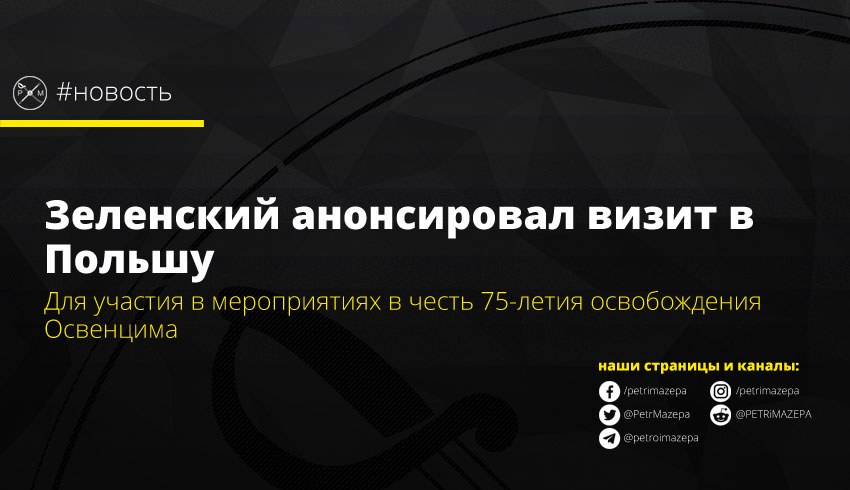 Президент Владимир Зеленский анонсировал рабочий визит в Польшу – он пройдет 26-27 января. Во время своей поездки Зеленский примет участие в памятных мероприятиях, которые пройдут в городе Освенцим в 75-ю годовщину освобождения концлагеря Аушвиц-Биркенау, и проведет встречу со своим польским коллегой Анджеем Дудой, сообщает пресс-служба президента.