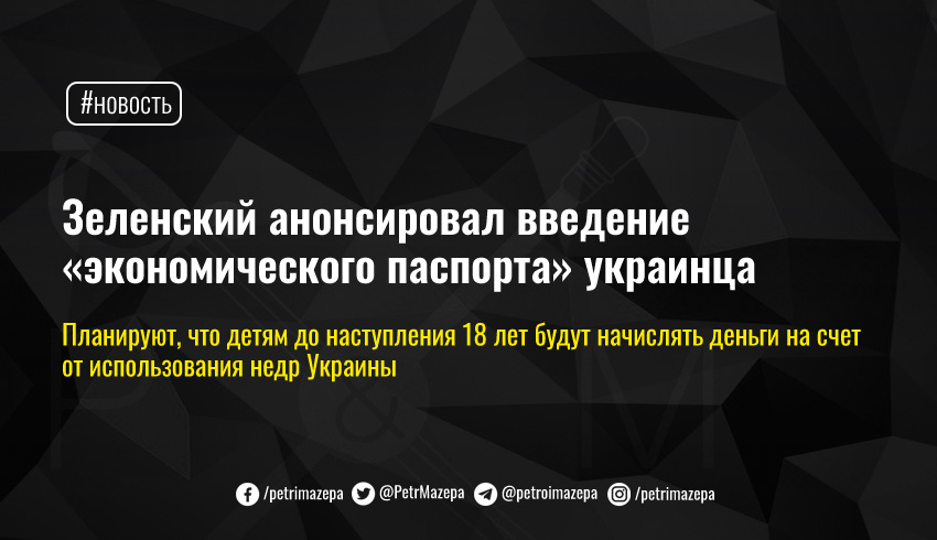 Глава государства добавил, что вскоре будет воплощено в жизнь его предвыборное обещание – введен «экономический паспорт» украинца. «По экономическому паспорту все рожденные в Украине дети до момента наступления 18 лет смогут получить средства от использования и добычи недр Украины. Они будут накапливаться на их персональном депозитном счете в банке. И после достижения совершеннолетия смогут быть потрачены ими на получение высшего образования в Украине», - заявил Зеленский в видеообращении, обнародованном на его странице в Facebook.