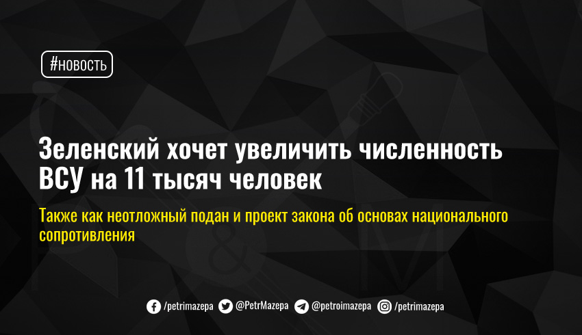 Президент Владимир Зеленский внес предложение Верховной Раде рассмотреть и принять как неотложные два связанных законопроекта - об основах национального сопротивления и об увеличении численность Вооруженных сил Украины (ВСУ).