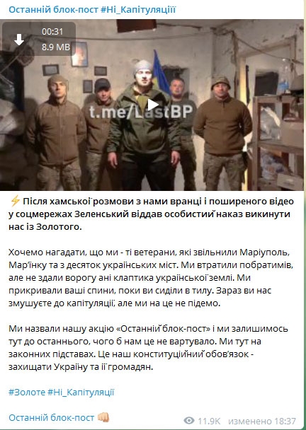 А вот сами ветераны, сообщили на Telegram-канале «Останній блок-пост #Ні_Капітуляціїї», что все не так радостно. «После хамского разговора с нами утром и распространенного видео в соцсетях Зеленский отдал личный приказ выбросить нас из Золотого», - говорят добровольцы. И напоминают, что они освобождали с десяток украинских городов и «сейчас вы нас принуждаете к капитуляции, но мы на это не пойдем».