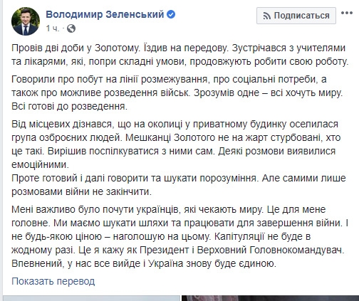 На свое странице в Facebook президент рассказал идиллическую историю о том, как за двое суток в Золотом он встречался с учителями и врачами, а также – ездил на передовую. Во время поездки Зеленский «понял одно - все хотят мира. Все готовы к разведению».