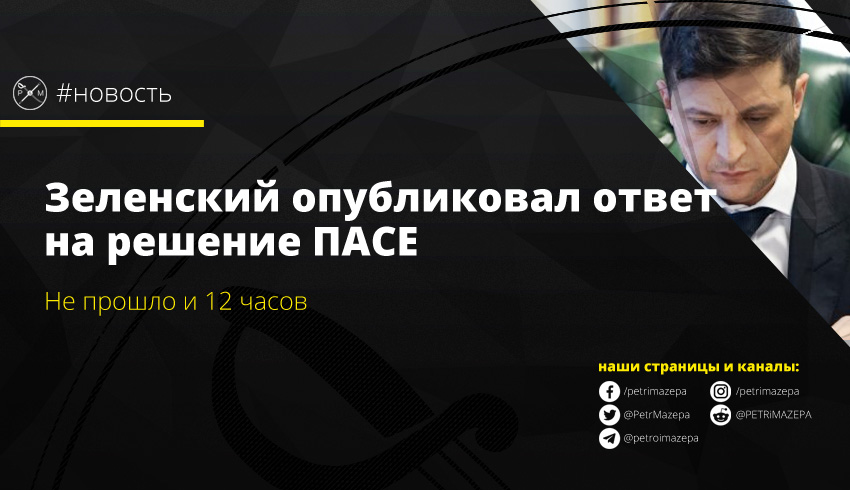 Президент Украины Владимир Зеленский только что на своей официальной странице в Facebook опубликовал ответ на ночное решение ПАСЕ, которое позволяет РФ вернуться к голосованию в Ассамблее, не выполняя при этом требований по возврату Крыма.