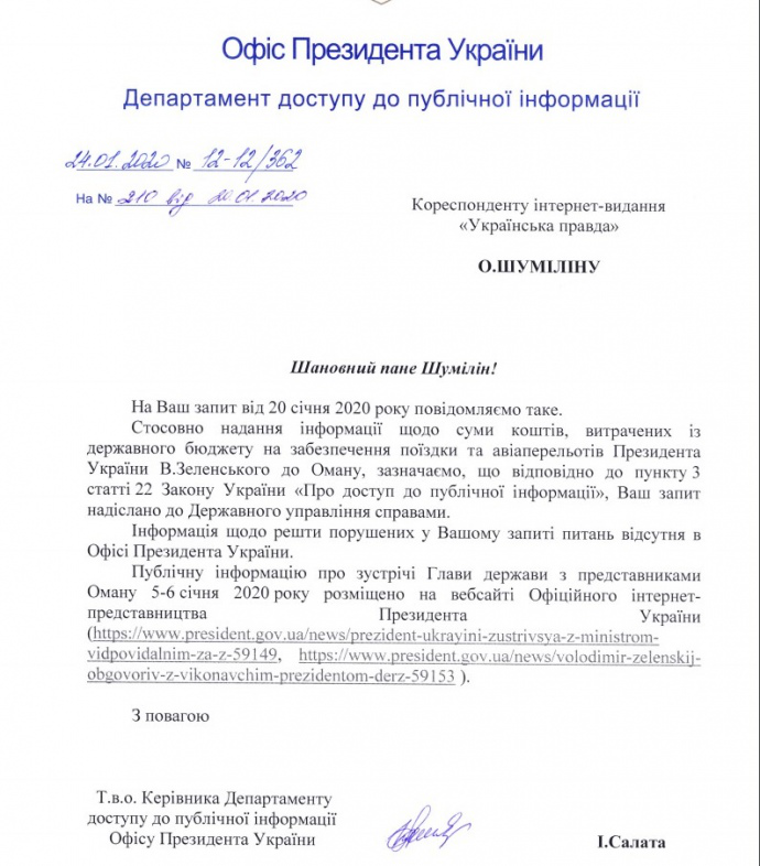 В то же время, на запрос Украинской правды в Офисе президента ответили, что запросы о стоимости перелетов и проживания президента передали в Государственное управление делами, а «информация об остальных затронутых в Вашем запросе вопросов отсутствует в Офисе Президента Украины». Журналисты издания запрашивали информацию о составе украинской делегации в Омане, а также стоимости проживания и перелетов. Кроме того, просилось сообщить, подписывались ли во время визита какие-либо официальные двусторонние документы с Оманом.