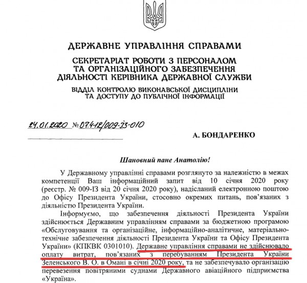 В государственном управлении делами заявили, что они не оплачивали расходы, связанные с нахождением президента Украины Владимира Зеленского в Омане, соответственно поездка была оплачена частным лицом.