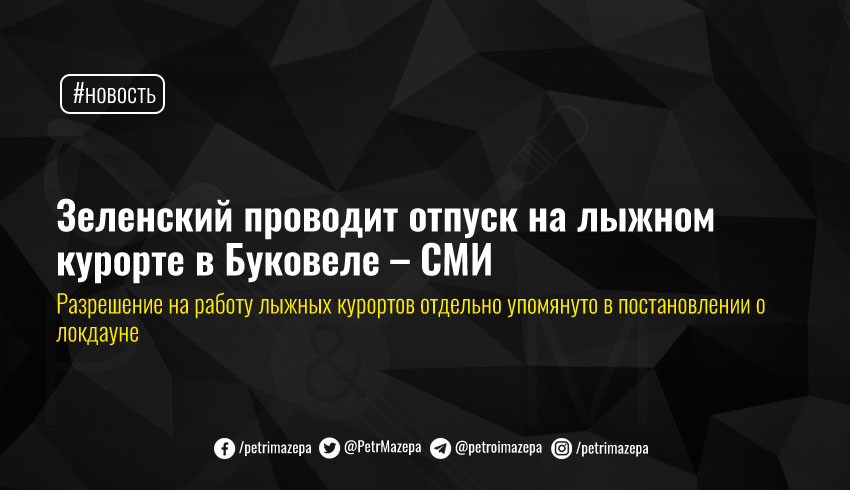 Президента Владимира Зеленского заметили на лыжном курорте в Буковеле – несмотря на то, что в Украине вступили в силу карантинные ограничения, президент их не нарушает, потому что работа лыжных курортов отдельно разрешена в постановлении Кабмина.