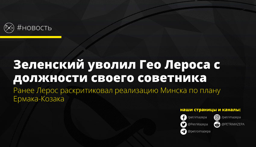 Президент Владимир Зеленский сегодня уволил народного депутата от фракции «Слуга народа» Гео Лероса с должности своего внештатного советника. Сам же Лерос как раз накануне дал интервью, в котором назвал неприемлемым «мир ценой сдачи национальных интересов и легализации террористов», раскритиковав план реализации Минских соглашений, включающий создание «Контактной группы».