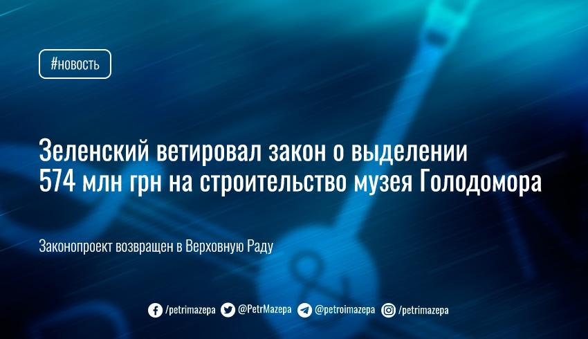 Президент Владимир Зеленский ветировал принятый Верховной Радой закон о выделении дополнительных 573,9 миллиона гривень на завершение строительства Национального музея Голодомора-геноцида.