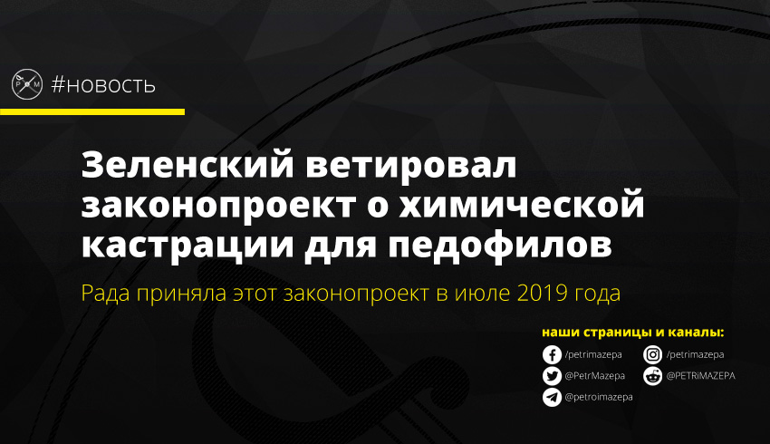 Сегодня, 4 сентября, законопроект № 6449 о химической кастрации и открытом реестре педофилов был возвращен в Верховную Раду с вето и предложениями от президента Владимира Зеленского. Суть предложений пока не оглашена.