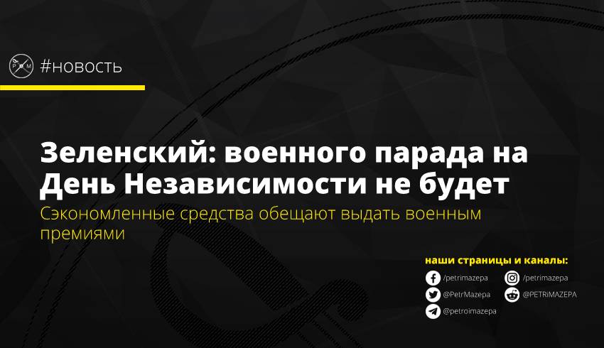 «Обычно на День Независимости у нас проходит парад – такой помпезный и точно недешевый. Однако в этом году вместо парада лучше эти деньги выделить нашим героям - военным. И мы приняли решение выделить 300 миллионов гривен на премии всем нашим военным – это солдаты срочной службы, курсанты, офицерам, все и обязательно военные, которые выполняют задачи в зоне проведения ООС. Но чествовать наших героев мы будем, праздновать День независимости тоже будем, но уже в новом формате», - заявил Зеленский.