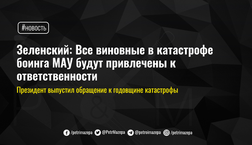 Президент Владимир Зеленский выпустил обращение к годовщине катастрофы боинга МАУ в Иране – пообещал, что все виновные будут привлечены к ответственности, и что вскоре у нас появится «памятное место», где можно будет почтить память погибших.
