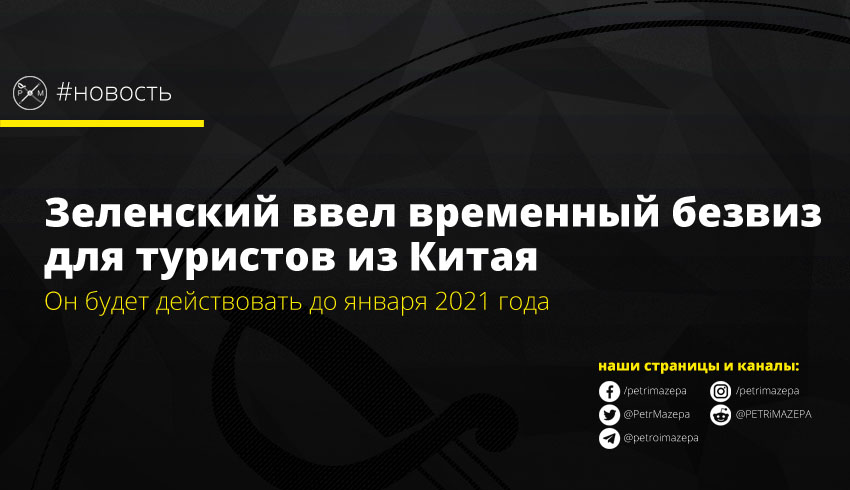 Президент Владимир Зеленский подписал указ № 295/2020 о временном внедрении безвизового режима для китайских туристов. Новые правила въезда в Украину для граждан КНР, посещающих нашу страну с туристической целью, будут действовать с 1 августа до 31 января 2021 года.