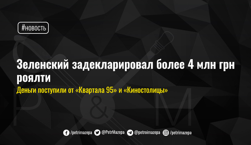В первой декларации указано, что 30 декабря Зеленский получил две выплаты роялти от «Квартала 95»: на 3,31 млн грн и 1,05 млн.