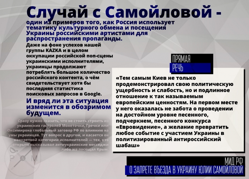Случай с Самойловой — один из примеров того, как Россия использует тематику культурного обмена и посещения Украины российскими артистами для распространения пропаганды. Даже на фоне успехов нашей группы KAZKA и в целом оккупации российской поп-сцены украинскими исполнителями, украинцы продолжают потреблять большое количество российского контента, о чём свидетельствует хотя бы последняя статистика поисковых запросов в Google. И вряд ли эта ситуация изменится в обозримом будущем. Потому было бы наивно предполагать, что Россия не хотела бы воспользоваться таким широким полем для манипуляций, как визиты этих артистов в Украину для проведения концертов.