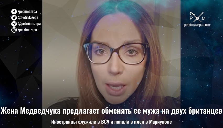Жена кума путина Виктора Медведчука Оксана Марченко записала видеообращение на русском и английском языках, в котором предложила провести обмен попавших в плен к российским оккупантам гражданах Великобритании на ее мужа. Для этого родственники пленных должны повлиять на премьер-министра Великобритании, чтобы тот надавил на Зеленского.