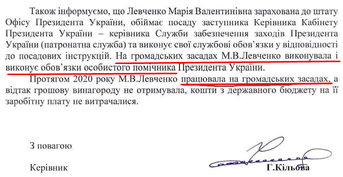 «Левченко Мария Валентиновна зачислена в штат Офиса Президента Украины, занимает должность заместителя Руководителя Кабинета Президента Украины - руководителя Службы обеспечения мероприятий Президента Украины (патронатная служба) и выполняет свои служебные обязанности в соответствии с должностными инструкциями. На общественных началах М.В. Левченко выполняла и выполняет личного помощника Президента Украины. В течение 2020 года М.В. Левченко работала на общественных началах», - говорится в документе, предоставленном «Українським новинам» Офисом президента.
