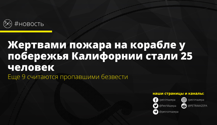 В США водолазы обнаружили тела 25 погибших с корабля Conception, который загорелся и затонул возле берегов острова Санта-Крус в Калифорнии. На данный момент еще девять человек числятся пропавшими безвести. Водолазы продолжают обследовать дно у места крушения