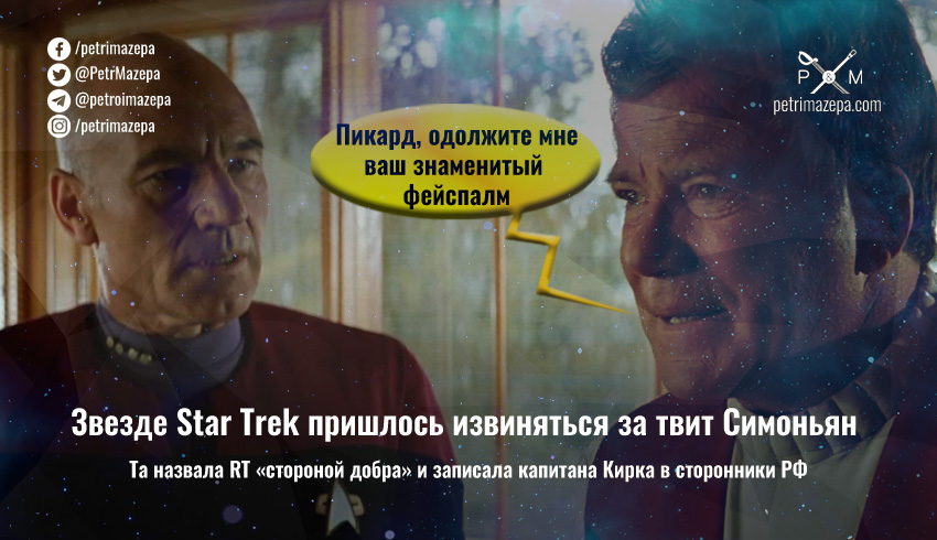 Но потом актеру показали анонс программы, который сделала главный редактор RT Маргарита Симоньян. Она написала, что Шетнер будет вести программу на RT и «Капитан Кирк перешёл на сторону добра».