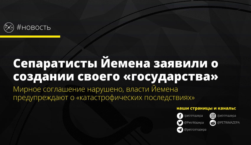 Сепаратисты Йемена заявили о создании собственного государства на юге страны. Создание самопровозглашеной республики нарушает соглашение между сепаратистами и признанным международным сообществом правительством Йемена. В МИД Йемена уже заявили, что такой шаг повлечет «опасные и катастрофические последствия».