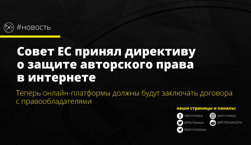 В Совете ЕС по сельскому хозяйству и рыболовству проголосовали и приняли новую директиву о защите авторского права в интернете. Она обязывает онлайн-платформы (YouTube, Facebook и Google News и т.д.) заключать соглашения с правообладателями, чтобы получить возможность использовать их работы онлайн.