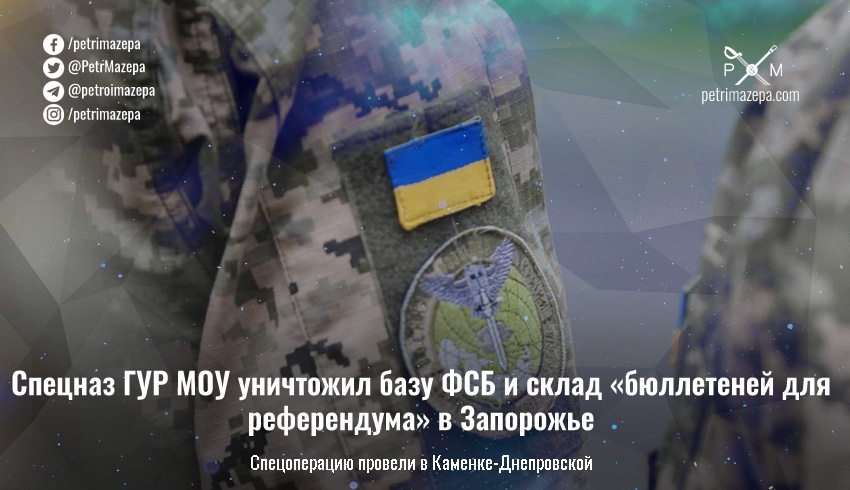 Бойцы спецназа Главного управления разведки Минобороны Украины провели спецоперацию в оккупированной Каменке-Днепровской Запорожской области — уничтожено место хранения бюллетеней для «референдума», место базирования подразделения ФСБ, которое этот склад обороняло, и еще несколько объектов, которые враг использовал как места базирования.