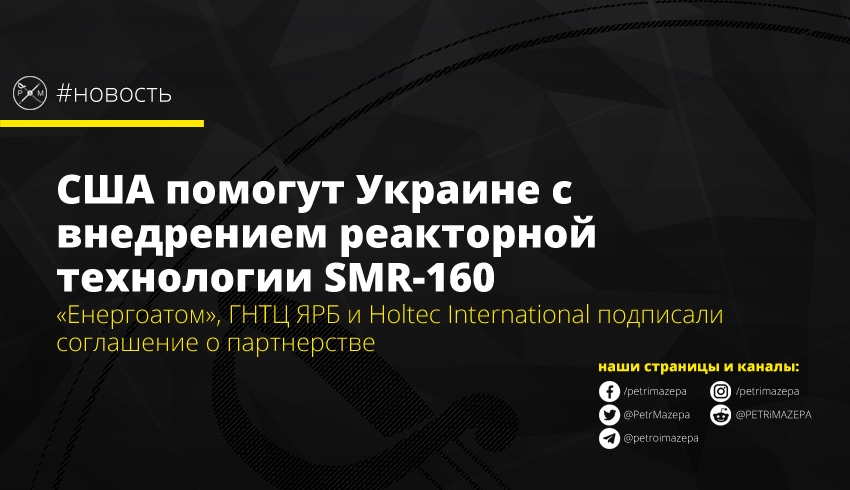 НАЭК «Енергоатом», Государственный научно-технический центр по ядерной и радиационной безопасности (ГНТЦ ЯРБ) и Holtec International в Камдене (штат Нью-Джерси, США) подписали соглашение о партнерстве. Согласно достигнутым договоренностям предусмотрено создание международного консорциума для того, чтобы помочь Украине внедрить технологии малых модульных реакторов.
