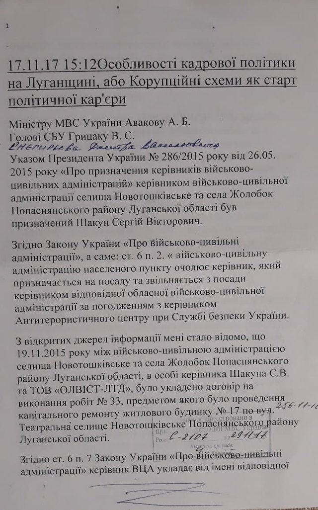 Нагадаю, 29 листопада 2017 року я, Дмитро Снєгирьов, звернувся до міністра МВС України Арсена Авакова та голови СБУ Грицака із заявою щодо вчинення кримінальних правопорушень посадовими особами військово-цивільної адміністрації селища Новотошківське та с. Жолобок Попаснянського району Луганської області.