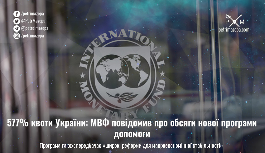 «Команда МВФ досягла домовленості на рівні персоналу з українською владою щодо чотирирічної програми за підтримки МВФ обсягом 11,6 мільярда SDR (приблизно $15,6 мільярда), або 577% квоти України», — зазначають у МВФ.