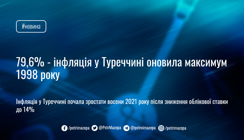 Стрімке зростання інфляції в Туреччині триває — ціни зростають уже 14 місяців поспіль. У липні споживча інфляція прискорилась до 79,6% у річному вимірі порівняно з 78,6% у червні. Таким чином, інфляція оновила максимум із вересня 1998 року. Про це свідчать дані статистичного інституту країни Turkstat.